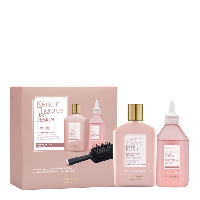 The Alfaparf Milano Professional Keratin Therapy Lisse Design Glass Hair 250ml Duo Pack is a premium hair care set designed to maintain and enhance the smoothness and shine of keratin-treated hair.