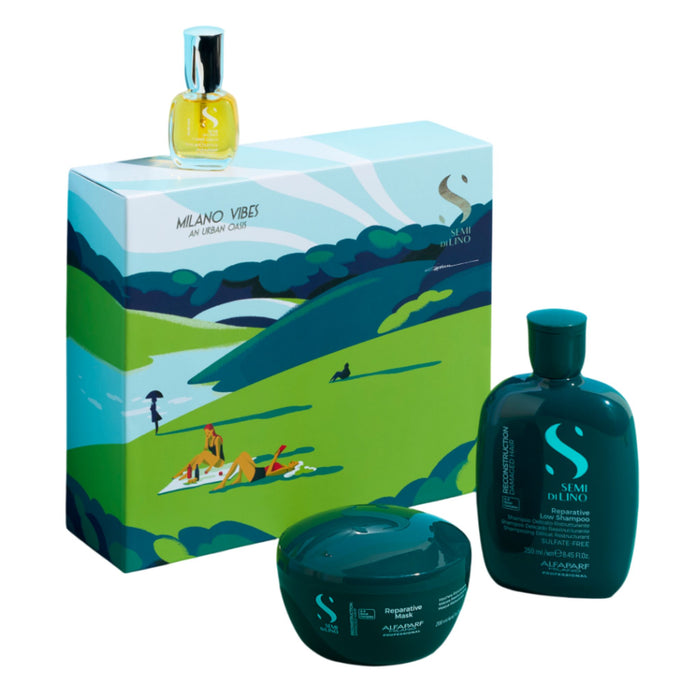 The Alfaparf Milano Vibes Semi di Lino Reconstruction Holiday Trio Kit is a luxurious hair care set designed to repair and rejuvenate damaged hair.