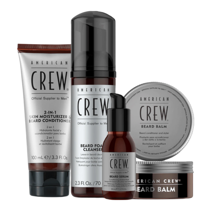 American Crew Beard Bundle includes a leave-in beard cleanser, beard balm, beard serum, and 2-in-1 moisturizer and beard conditioner, perfect for conditioning and maintaining a healthy beard.
