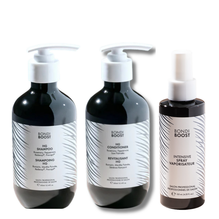 This powerful trio from Bondi Boost includes a shampoo, conditioner, and intensive spray, all formulated with natural ingredients to nourish and strengthen your hair from root to tip. The HG Shampoo gently cleanses while promoting scalp health, the HG Conditioner provides essential moisture and detangling benefits, and the Intensive Spray targets thinning areas with a concentrated formula. Together, they work synergistically to enhance hair volume and vitality, making it an ideal choice for those seeking to improve hair thickness and overall appearance.
