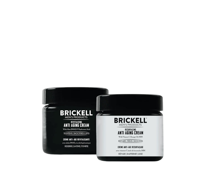 This powerful duo combines two of Brickell's most effective anti-aging creams, providing a complete day and night routine to help reduce wrinkles, fine lines, and other signs of aging. The Resurfacing Anti-Aging Cream is formulated to rejuvenate and refresh your skin during the day, while the Revitalizing Anti-Aging Cream works overnight to repair and restore your skin's youthful appearance. Both creams are scented, offering a refreshing and invigorating experience with each application.