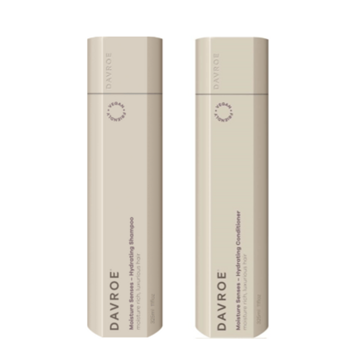 The Davroe Moisture Senses Hydrating Shampoo and Conditioner Bundle contains Davroe Moisture Senses Hydrating Shampoo 325ml and Davroe Moisture Senses Hydrating Conditioner 325ml, perfect for nourishing dry, damaged hair.