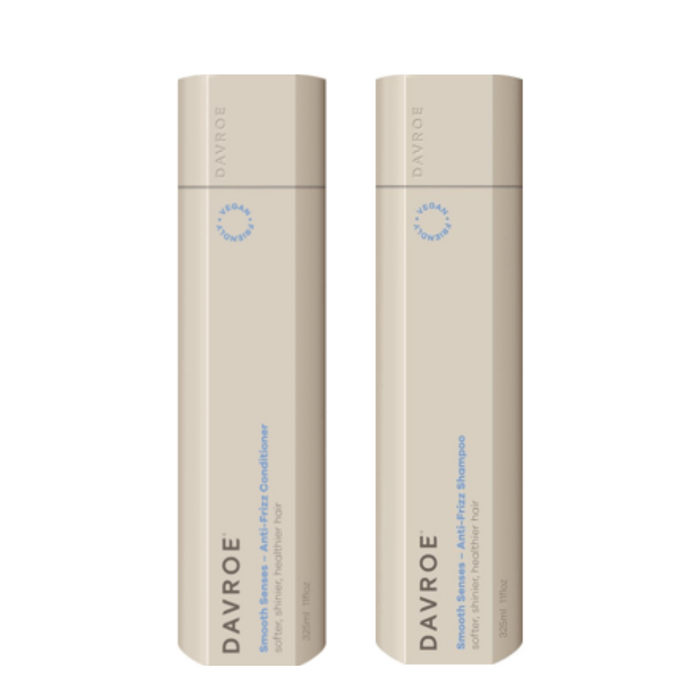 The Davroe Smooth Senses Anti-Frizz Shampoo and Conditioner Bundle contains a moisture-rich and balancing shampoo and conditioner formulated to soften, smooth, and add luminous shine to normal and dry hair.