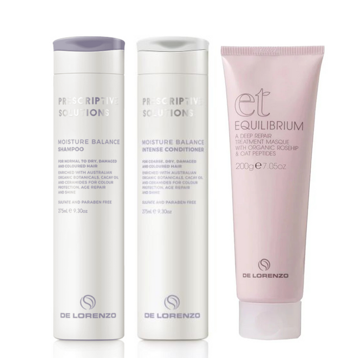 The De Lorenzo Prescriptive Solutions Moisture Balance Intense Trio Bundle is the ultimate hair care solution for achieving hydrated and healthy hair.