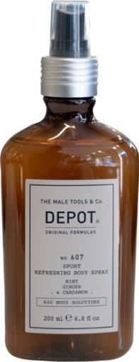 What are the benefits and features of Depot No. 607 Sport Refreshing Body Spray 200ml?- Refreshes, hydrates, and tones the skin with a mint, ginger, and cardamom fragrance.