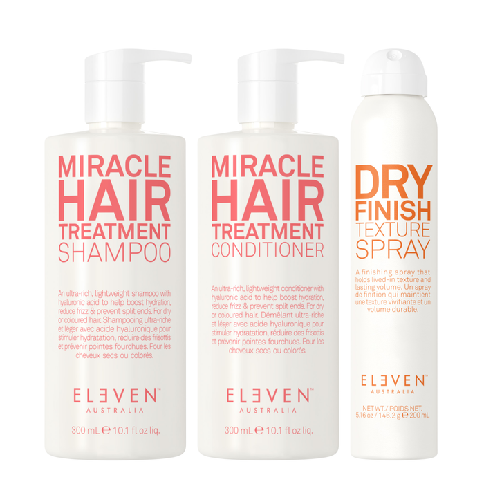 This ELEVEN Australia Trio Bundle includes the Miracle Shampoo, Miracle Conditioner, and Dry Finish Texture Spray to give your hair the ultimate care and styling it deserves.