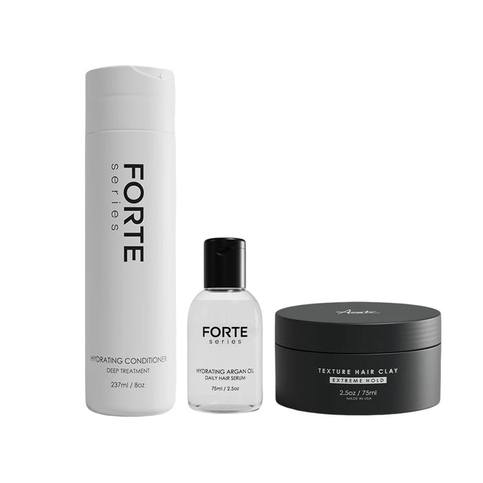 This comprehensive bundle is designed to provide everything you need for optimal hair care and styling. The Forte Series "Extreme Hold" Thick Hair Control System Bundle includes a hydrating conditioner to nourish and moisturize, a hydrating argan oil to add shine and smoothness, and a texture clay for extreme hold and styling versatility. Perfect for those with thick hair, this bundle ensures your hair looks and feels its best every day.