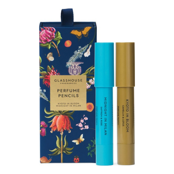 This exquisite set features two of Glasshouse's most beloved fragrances in a convenient pencil form, allowing you to effortlessly apply your favorite scents anytime, anywhere. Encased in a beautifully illustrated limited edition gift box, this set makes for an ideal gift or a treat for yourself. The Kyoto In Bloom scent captures the essence of cherry blossoms in full bloom, while Midnight In Milan offers a rich, sophisticated aroma inspired by the vibrant nightlife of Milan.