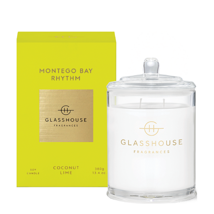 Glasshouse MONTEGO BAY RHYTHM Candle 380g is a luxurious candle that creates an instant ambience with its mouth-watering blend of zesty lime, coconut, and boozy vanilla.