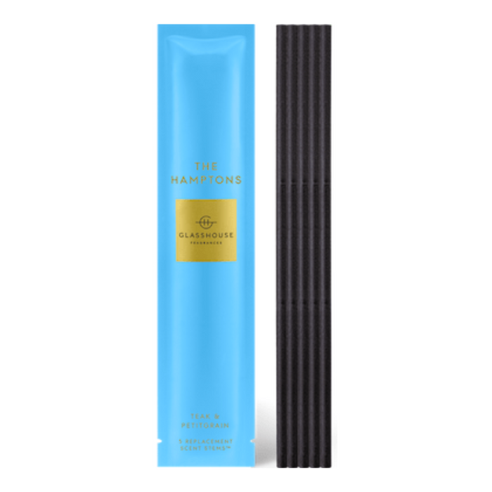 Glasshouse THE HAMPTONS Replacement Scent Stems x5 TEAK & PETITGRAIN are extra scent scene refills that will keep the ambience going with the fragrance of sunshine, soft cashmere, and expensive gin.