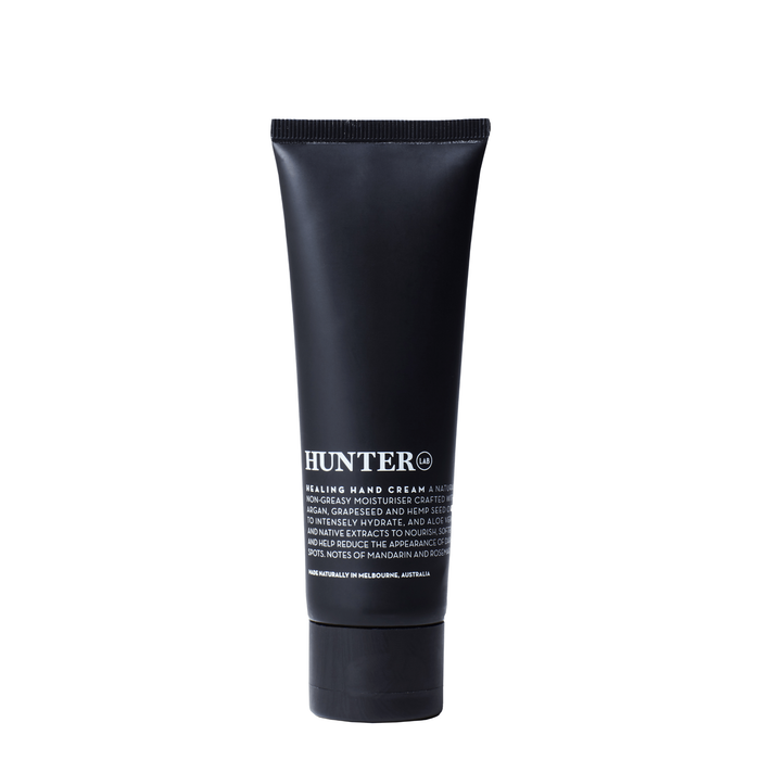 Hunter Lab Healing Hand Cream 80ml is a natural, ultra-nourishing, non-greasy travel moisturiser crafted with Argan, Grapeseed and Hemp Seed oils to intensely hydrate, and Aloe Vera and Native extracts to nourish, soften and help reduce the appearance of dark spots and fine lines.