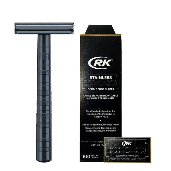 The Henson Shaving AL13 Aggressive DE Safety Razor Gray & Blades Bundle offers a premium shaving experience with precision and comfort.