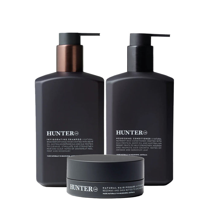 This premium bundle combines the best of Hunter Lab's hair care products to provide a comprehensive solution for cleansing, conditioning, and styling your hair. Crafted with natural ingredients, each product in the bundle is formulated to nourish and protect your hair, leaving it healthy and manageable. Whether you're looking to refresh your hair with a deep cleanse, hydrate and strengthen it, or achieve a polished look with a natural finish, this bundle has you covered.