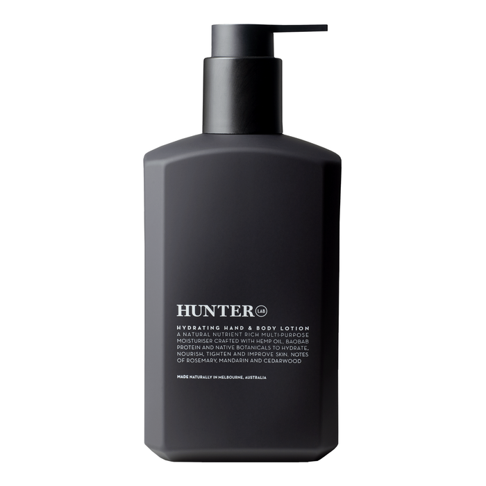 Hunter Lab Hydrating Hand & Body Lotion 550ml is a natural nutrient-rich multi-purpose moisturizer crafted with hardworking Hemp Oil and Baobab Protein, and native Aniseed Myrtle, Mountain Pepper, and Wild Rosella Flower extracts to intensely hydrate and nourish the skin.