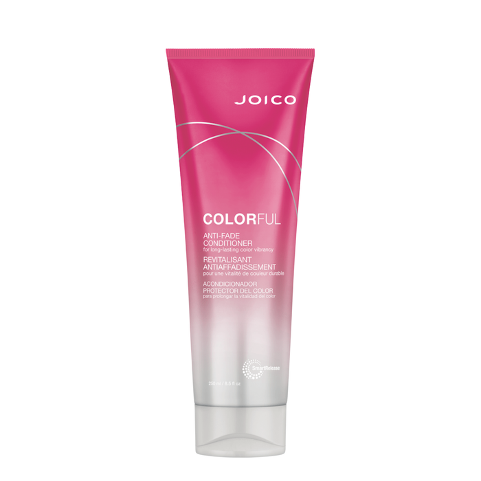 Joico Colorful Anti-Fade Conditioner 250ml protects haircolor for long-lasting vibrancy and tonal integrity, delivering smooth, shiny, vibrant results on a daily basis.