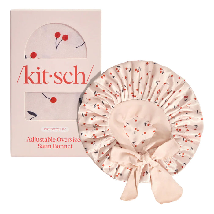 The Kitsch Adjustable Oversized Satin Bonnet 1pc - Cherry Print is a stylish and functional hair accessory designed to protect your hair while you sleep.