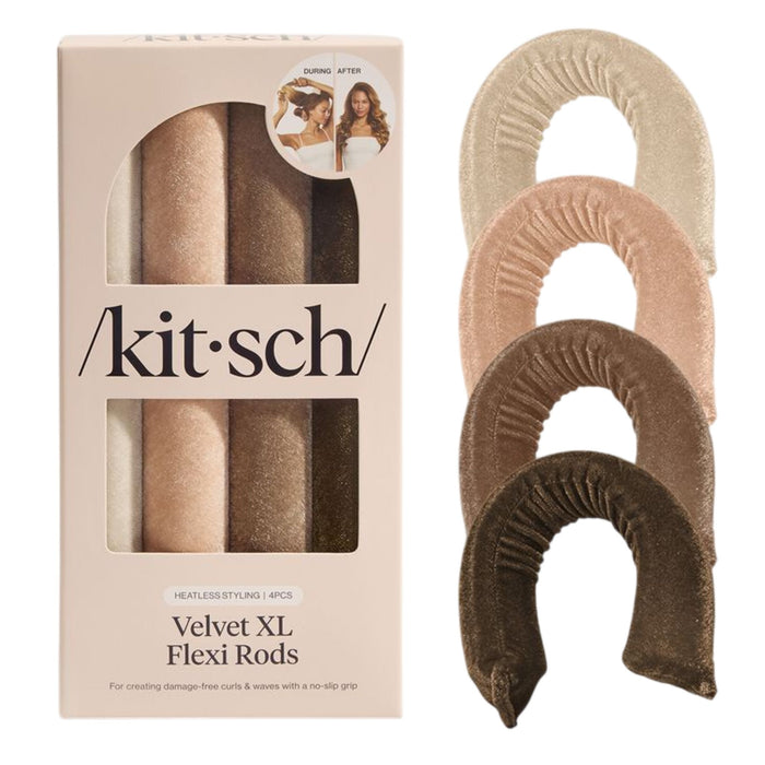 Transform your hair styling routine with the Kitsch Velvet XL Flexi Rods 4pc Set in a soothing eucalyptus color. These extra-large flexi rods are crafted with a soft velvet exterior, ensuring a gentle touch on your hair while providing a secure hold for creating voluminous curls. Perfect for all hair types, these rods offer a heat-free styling solution that helps maintain the health and integrity of your hair.