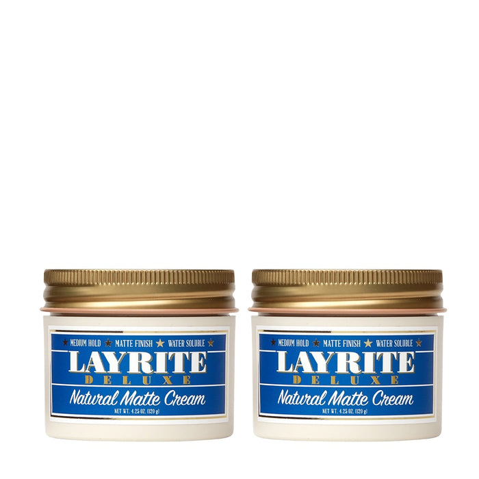 Layrite Natural Matte Cream Duo Bundle includes 2 x Layrite Natural Matte Cream 120g, a lightweight, water-based shaping cream that adds texture with flexible, all-day hold for a range of styles from easy and laid-back to more defined.
