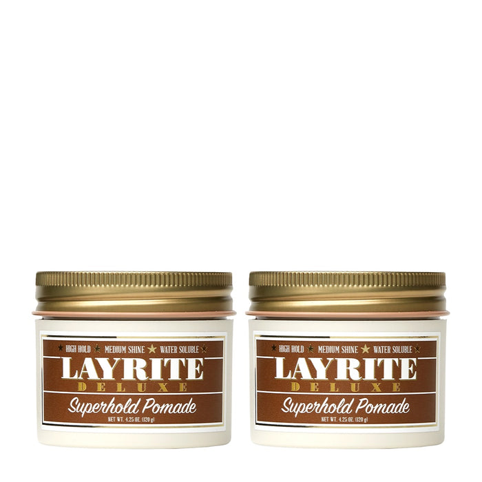 The Layrite Superhold Pomade Duo Bundle includes 2 x Layrite Superhold Pomade 120g, perfect for sculpting extremely curly, course, and thick hair or creating high-elevation men's hairstyles that require extreme hold.