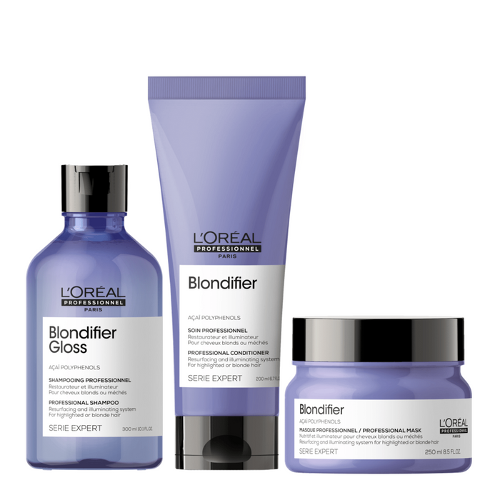 The L'Oréal Professionnel Blondifier Bundle is a hair care set designed to revive blonde hair and keep it shiny, nourished, and radiant.