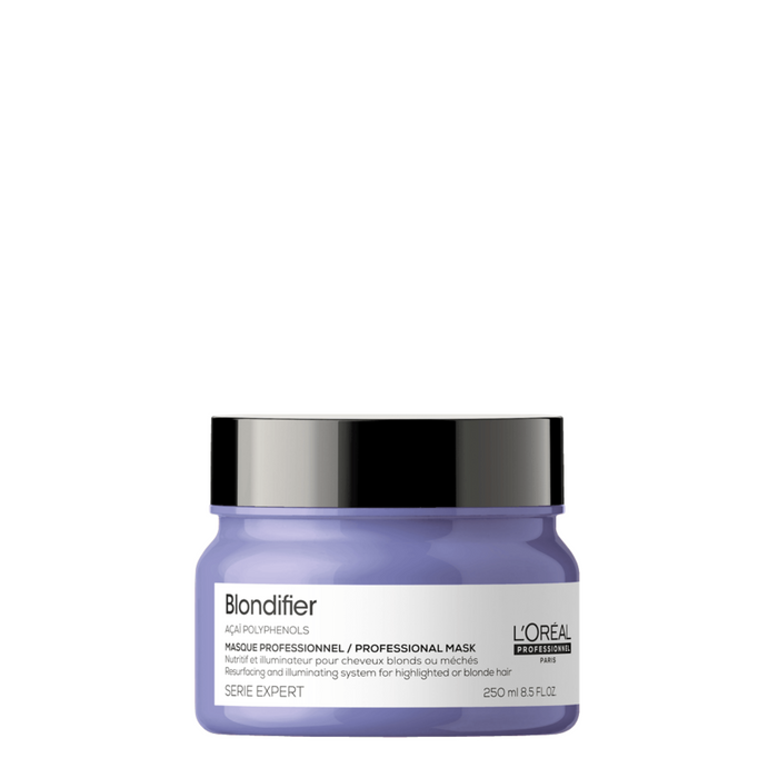 The L'Oréal Professionnel Blondifier Mask 250ml is a nourishing mask enriched with Polyphenols present in the Açai berry extract that resurfaces and illuminates blonde hair, enhancing shine and radiance.