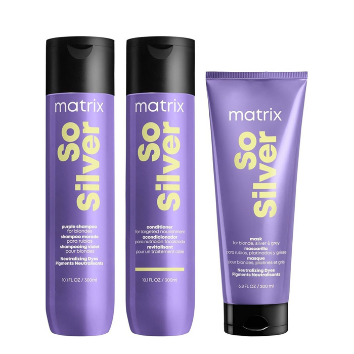 The Matrix Total Results Color Obsessed So Silver Trio Bundle includes a neutralizing shampoo, conditioner, and triple power mask designed to cleanse, condition, and tone blonde, platinum, and grey hair while eliminating unwanted brassy warmth and yellow tones.