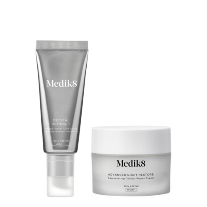 The Medik8 Crystal Retinal 3 and Advanced Night Restore Bundle is a powerful anti-aging skincare set that includes a night serum and cream to resurface, renew, and deeply hydrate the skin while reducing the appearance of fine lines and wrinkles.
