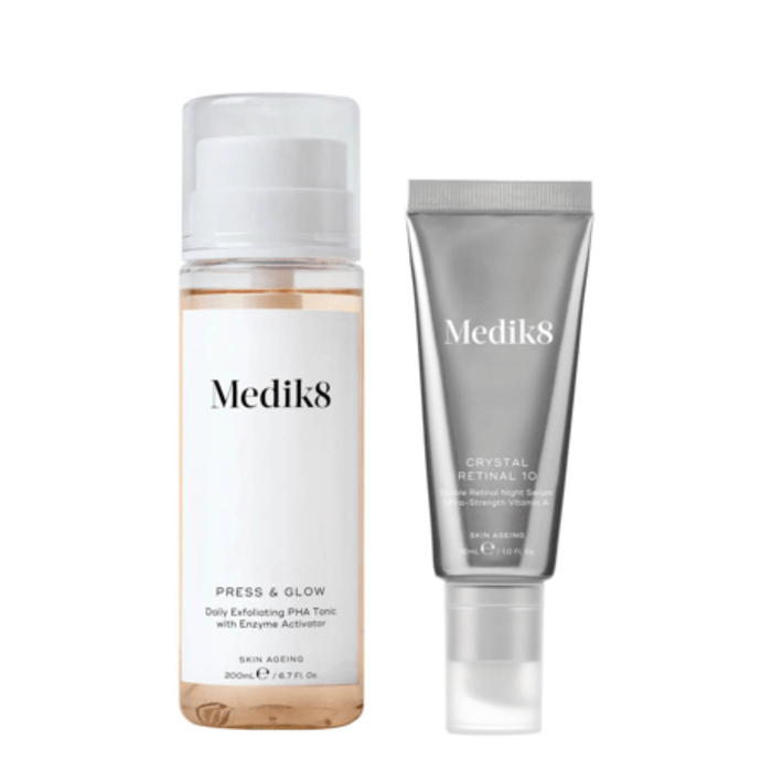The Medik8 Press and Glow and Crystal Retinal 10 Bundle is a powerful skincare duo that includes the Press & Glow Daily Exfoliating PHA Tonic and the Crystal Retinal 10 Night Serum, designed to resurface, hydrate, and smooth the skin for a youthful and radiant complexion.