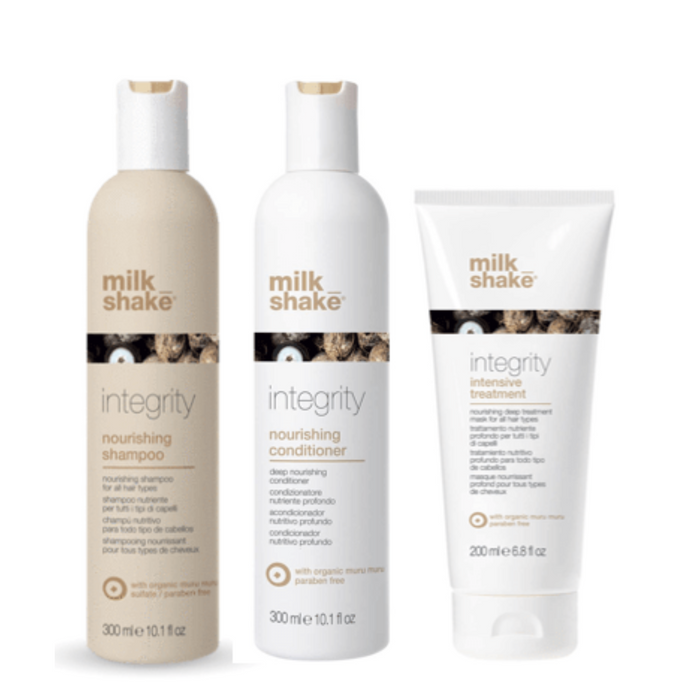 This bundle contains three products: milk_shake Integrity Nourishing Shampoo 300ml, milk_shake Integrity Nourishing Conditioner 300ml, and milk_shake Integrity Intensive Treatment 200ml. The milk_shake Integrity Nourishing Shampoo is designed to protect dry ends, battles frizz, and injects moisture into hair while protecting its color. The milk_shake Integrity Nourishing Conditioner is specifically formulated to nourish and condition all hair types while maintaining hair color. The milk_shake Integrity Intensive Treatment deeply nourishes hair and eliminates frizz, leaving hair soft, shiny, and more manageable while maintaining hair color.