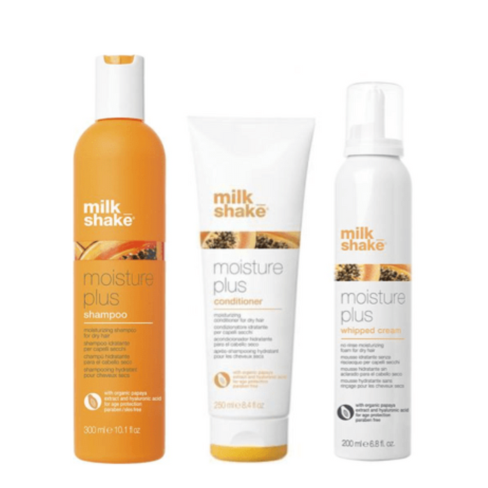 The milk_shake Moisture Plus Trio Bundle includes a moisturizing shampoo, conditioner, and whipped cream that work together to give softness and manageability to dry hair while maintaining the hair's optimal moisture balance.