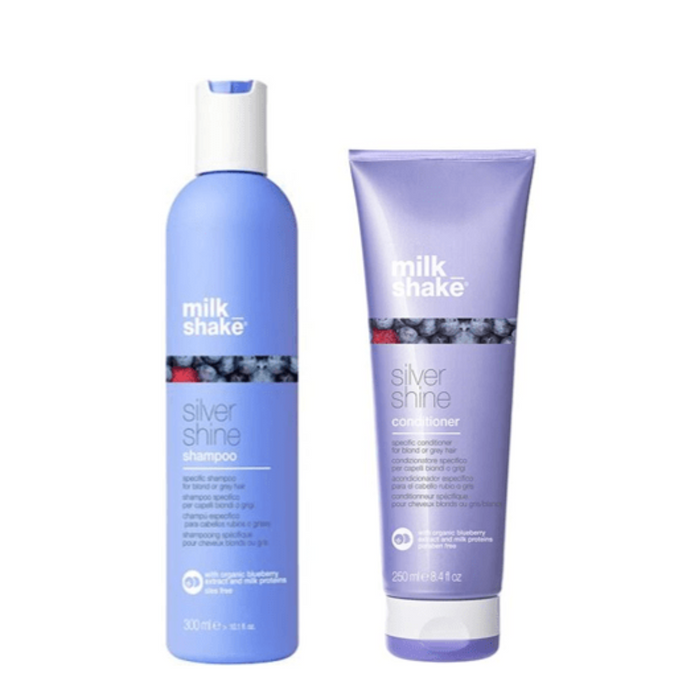 The milk_shake Silver Shine Shampoo and Conditioner Bundle is a hair care set specifically designed for blond or grey hair, containing a delicate cleanser and a conditioner enriched with organic mixed berry extracts and milk proteins for shiny, soft, and healthy hair.