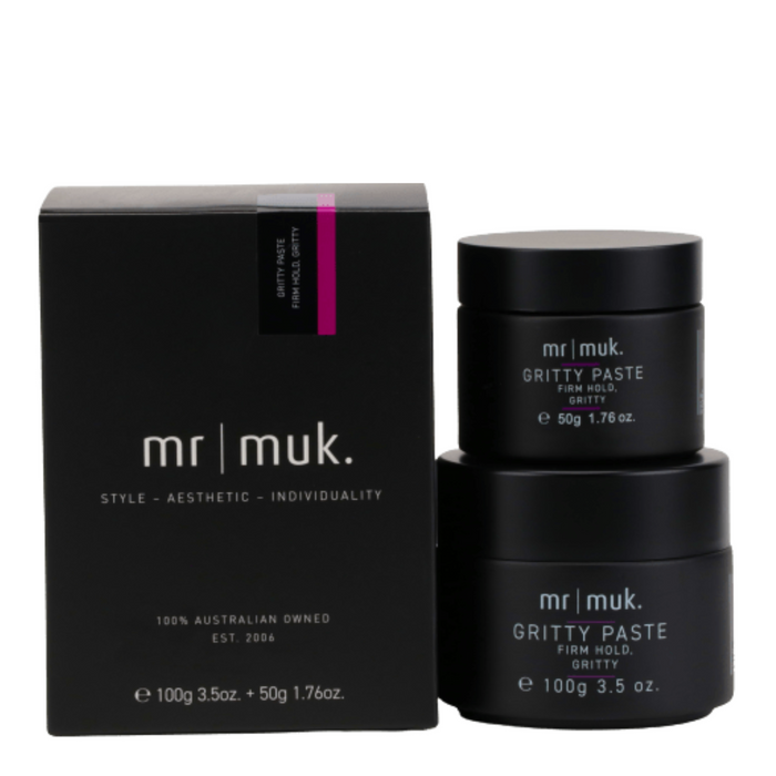 Muk Mr Muk Gritty Paste 100g + 50g Duo Pack is a firm hold finishing paste with grit galore, perfect for creating and re-working roughed up styles without any flaking.
