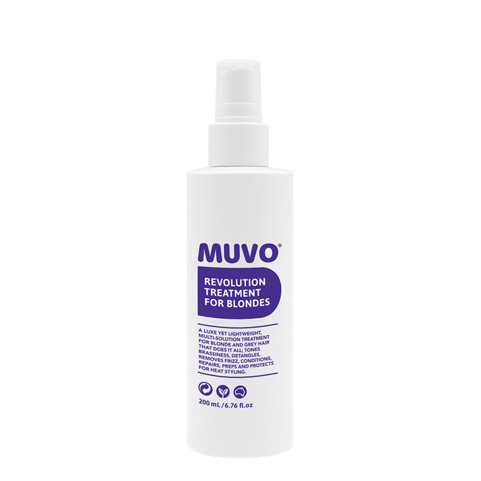 MUVO Revolution Treatment for Blondes 200ml is a multi-solution, leave-in spray treatment for blonde and grey hair that instantly tones away brassiness, detangles, removes frizz, preps for heat styling, provides extreme heat protection for up to 220*, protects from environmental exposure, and is lightweight.