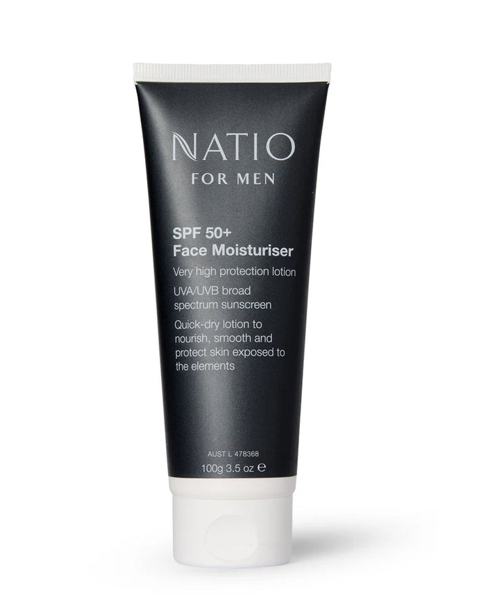 Natio For Men SPF 50+ Face Moisturiser 100g is a nourishing daily moisturising lotion that provides very high level sun protection and defends skin against both sun damage and visible signs of ageing.