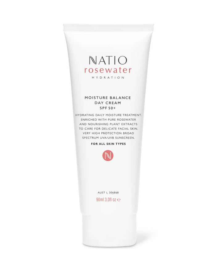 Natio Rosewater Hydration Moisture Balance Day Cream SPF 50+ 90ml is a daily moisture treatment with SPF 50+ broad spectrum UVA/UVB sunscreen that combines very high sun protection with balanced skin hydration.