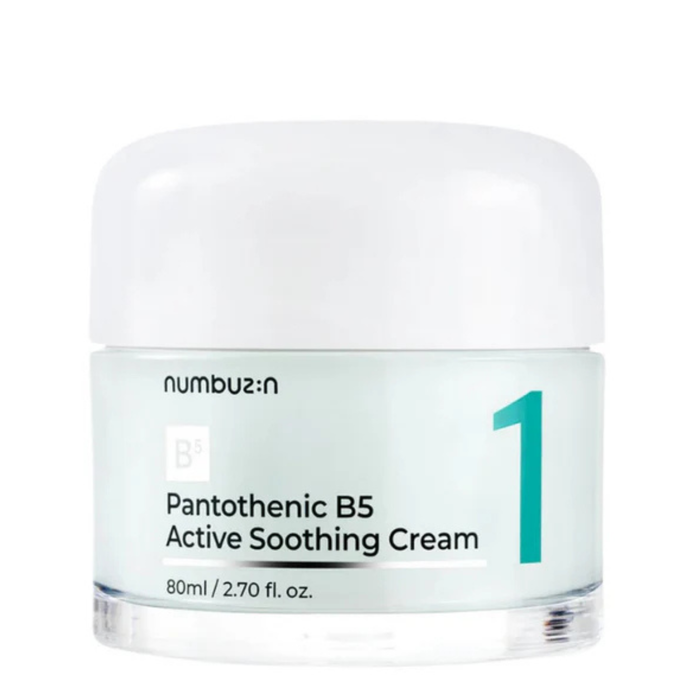 The Numbuzin No.1 Pantothenic B5 Active Soothing Cream 80ml is a calming and hydrating cream designed to soothe sensitive skin.