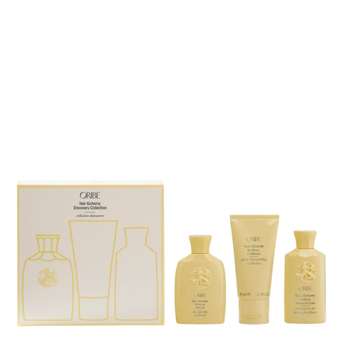 The Oribe Hair Alchemy Discovery Travel Size Pack is a luxurious hair care set designed to strengthen and protect your hair on the go.