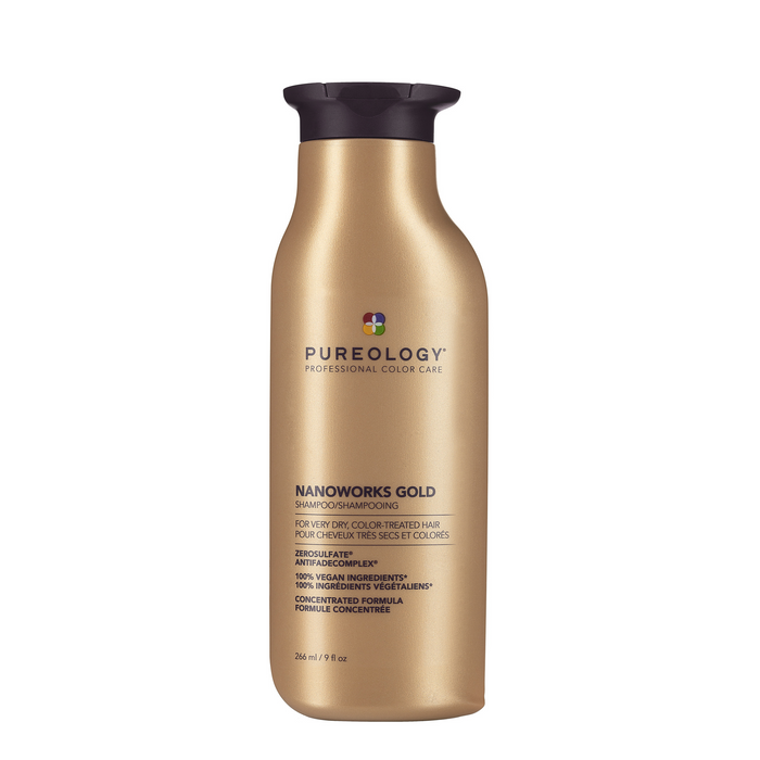 Pureology Nanoworks Gold Shampoo 266ml renews softness, manageability, and shine with key ingredients Keravis and Golden Marula Oil and a signature aromatherapy blend of Dewy Pear, Ylang Ylang, and Golden Amber.