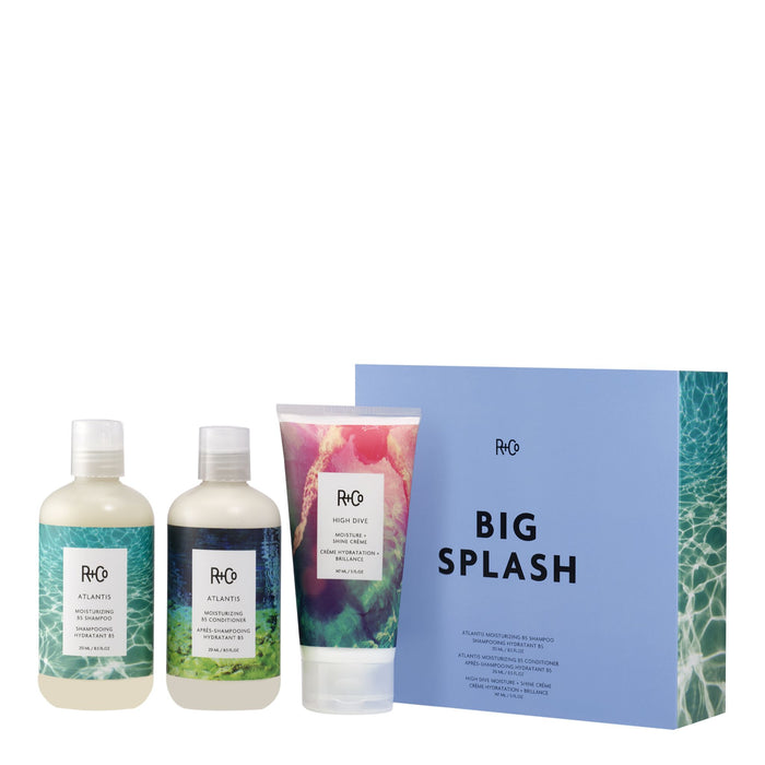 The R+Co Big Splash Pack is a comprehensive hair care bundle designed to deliver intense moisture and shine.