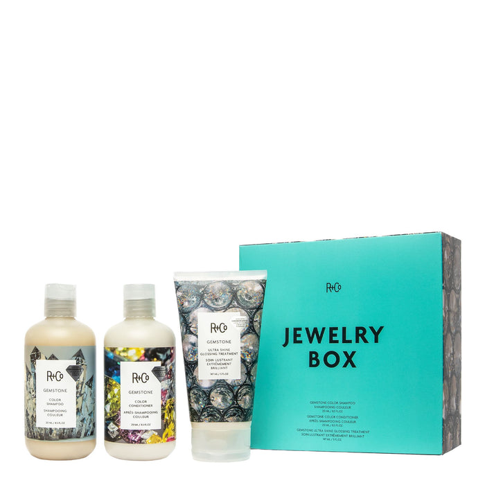 The R+Co Jewelry Box Pack is perfect for anyone with color-treated hair looking to maintain vibrant color and achieve a glossy, salon-quality finish.