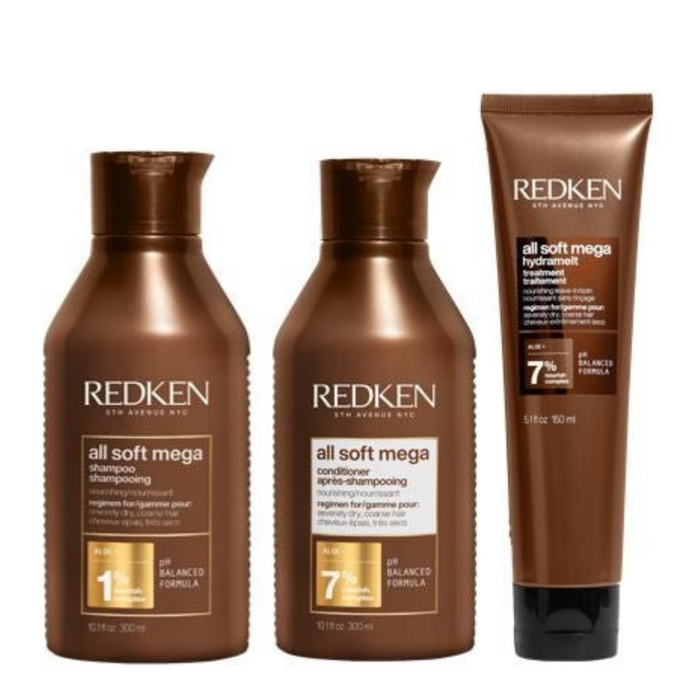 The Redken All Soft Mega Trio Bundle includes the All Soft Mega Rich Shampoo, All Soft Mega Rich Conditioner, and All Soft Mega Rich Hydramelt, designed to deliver ultimate hydration and nourishment for medium to coarse hair types that struggle to retain enough moisture with regular hydration products.