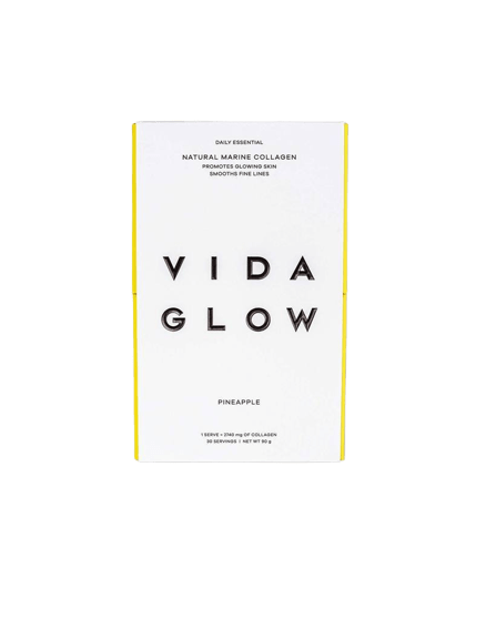 Vida Glow Marine Collagen Pineapple 30 x 3g is a collagen peptide supplement made from sustainably-sourced fish skin that supports the natural ageing process for firm, youthful-looking skin, thick hair, and strong nails.