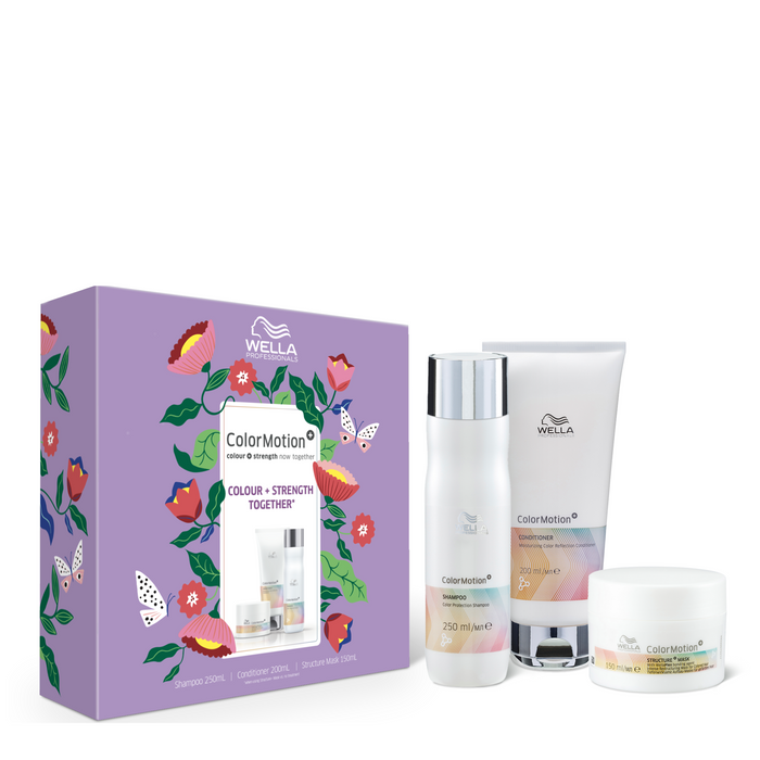 This Wella Professionals Premium Care Colormotion+ Color Protection Trio Set includes a ColorMotion+ Color Protection Shampoo, a ColorMotion+ Mosturising Color Reflection Conditioner, and a ColorMotion+ Structure+ Mask with WellaPlex Bonding Agent to keep your hair color vibrant and protected.