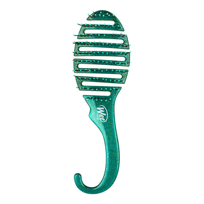 The Wet Brush Shower Flex - Green Glitter is a versatile detangling brush designed for use in the shower.