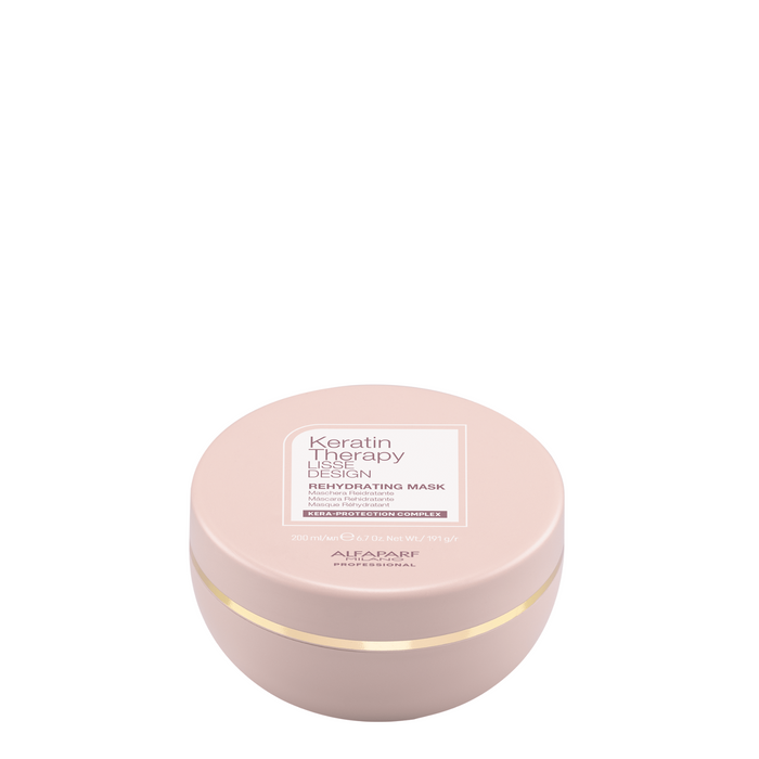 Alfaparf Milano Professional Keratin Therapy Lisse Design Rehydrating Mask 200ml is a rehydrating mask that protects and strengthens hair, counteracting the natural drying process while helping to maintain and prolong the cosmetic results obtained with professional smoothing treatments with keratin.