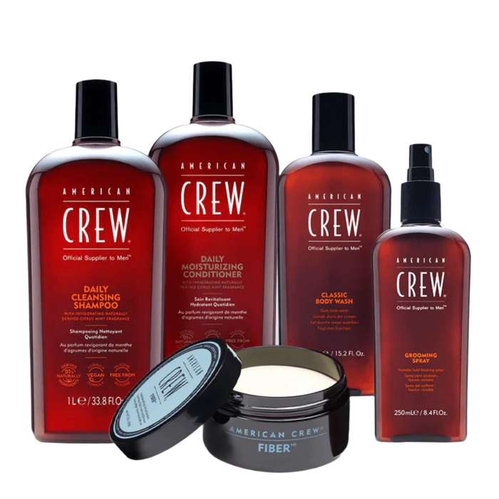 The bundle includes the Fiber product, Daily Cleansing Shampoo, Daily Moisturizing Conditioner, Classic Body Wash, and Grooming Spray. The Fiber product is a fiber-like, resinous product that helps thicken, texturize, and increase fullness to hair, providing a strong, pliable hold with a matte finish. The Daily Cleansing Shampoo is enriched with Vitamin B5 for moisture and is ideal for an everyday hair care routine, washing away excess oil and leaving hair more manageable, looking healthy, and feeling soft. The Daily Moisturizing Conditioner restores, strengthens, and protects hair, leaving it feeling soft, manageable, and ready for styling. The Classic Body Wash has a refreshing scent and naturally nourishes and moisturizes the skin to increase elasticity. Finally, the Grooming Spray is an incredibly flexible product that can be used on damp or dry hair to hold styles in place, reduce fly-away tendencies, and add shine and manageability.