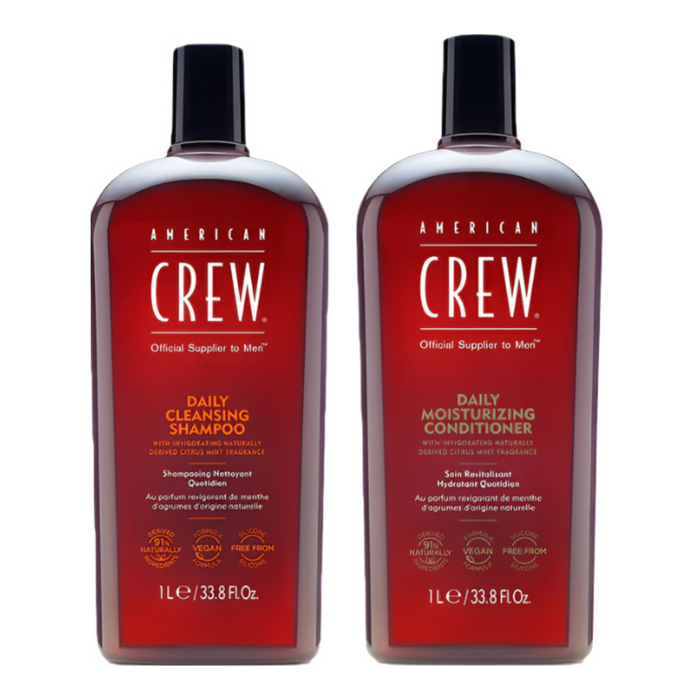 American Crew Shampoo & Conditioner Duo Bundle includes the Daily Cleansing Shampoo and Daily Moisturizing Conditioner, both enriched with Vitamin B5 for moisture and suitable for men with normal to oily or normal to dry hair.
