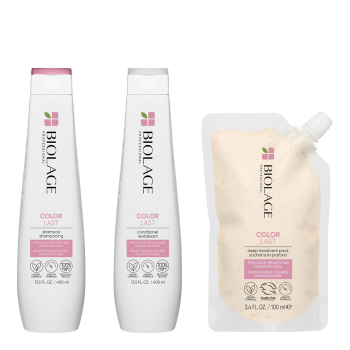 The Biolage Colorlast Trio Bundle includes Biolage Colorlast Shampoo, Biolage Colorlast Conditioner, and Biolage Colorlast Deep Treatment Pack, all designed to preserve the vibrancy of colored hair and maintain its depth, tone, and shine.