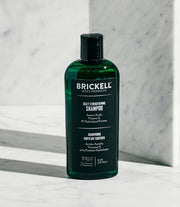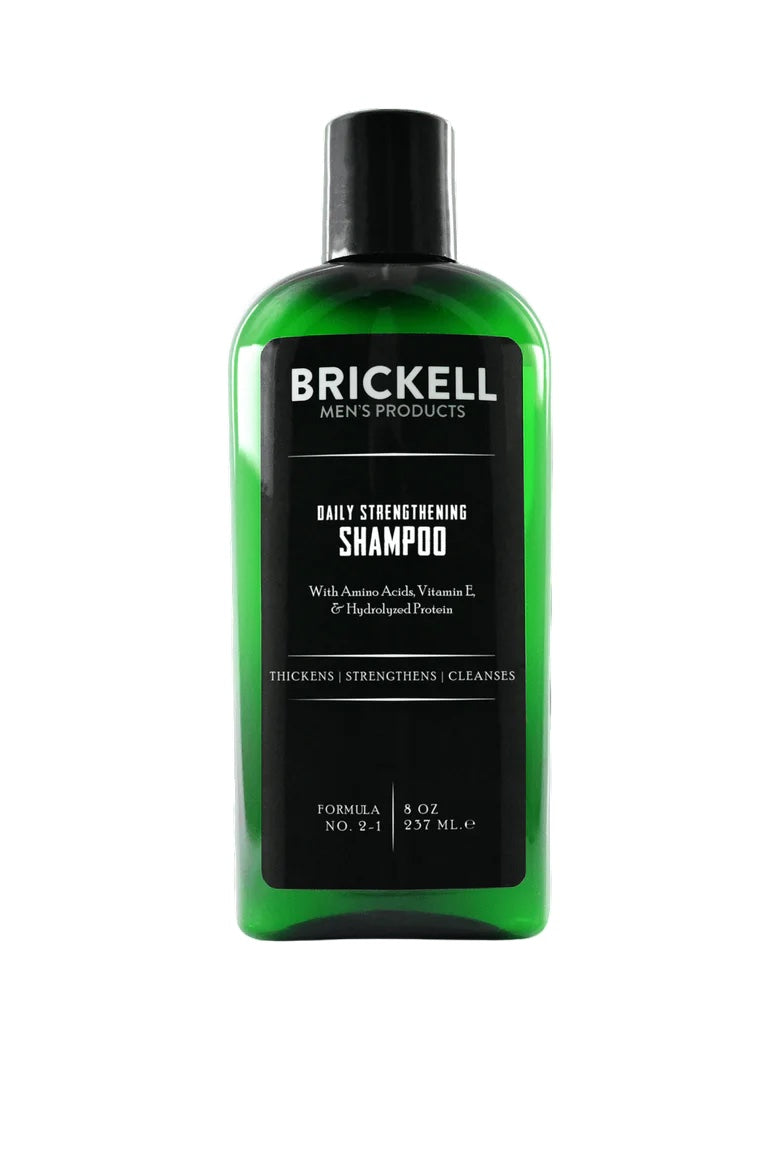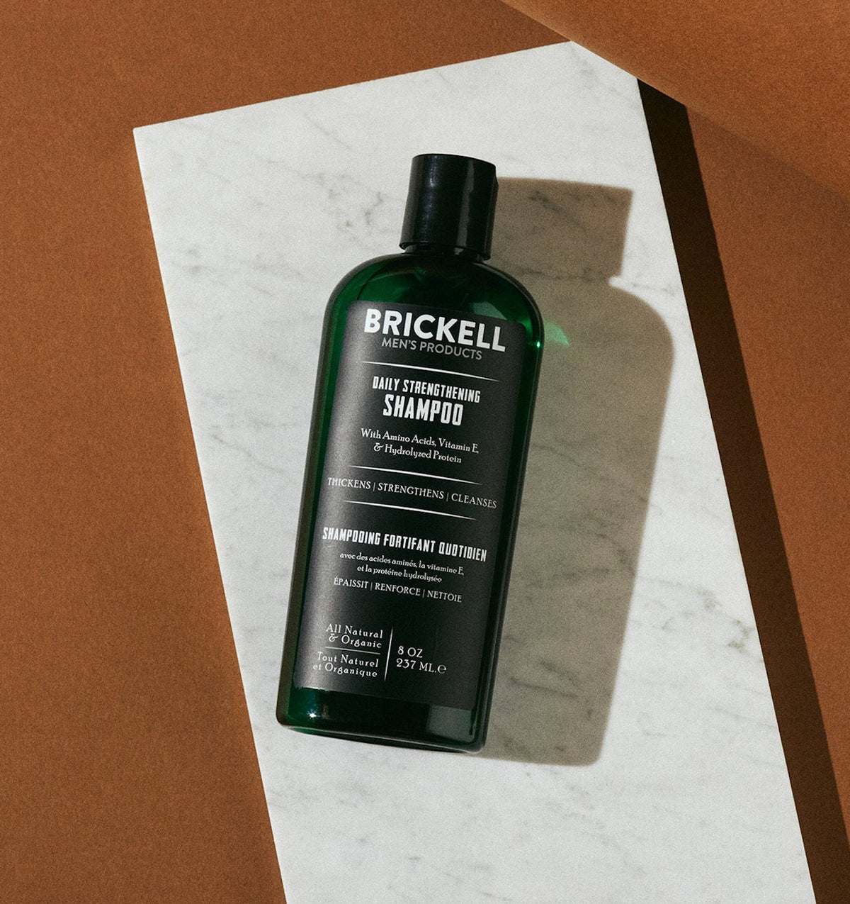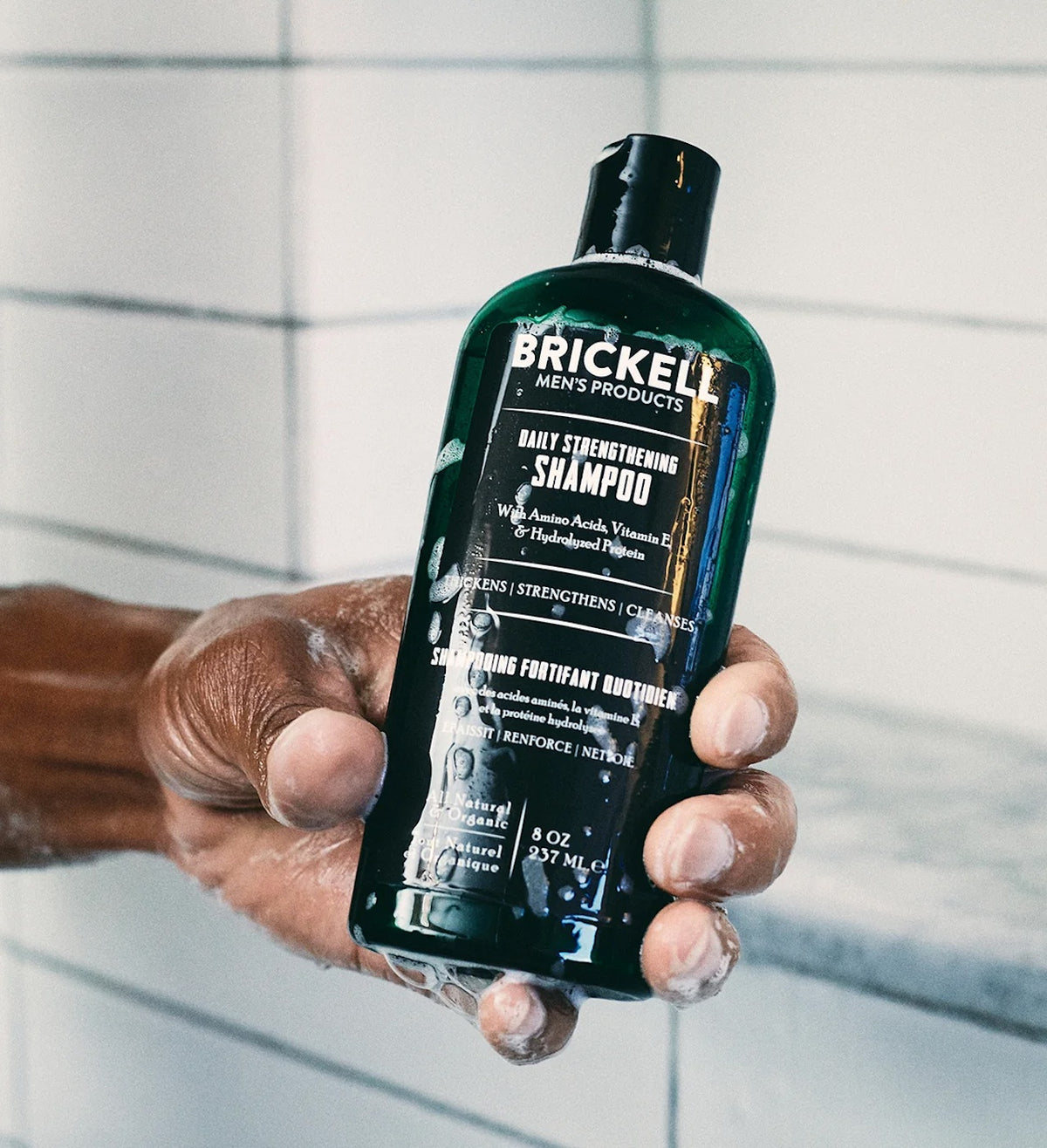 - Apply a small amount of Brickell Daily Strengthening Shampoo to your scalp and hair.