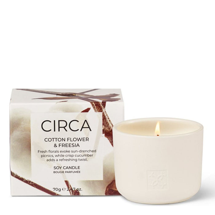 The CIRCA Candle 70g - Cotton Flower & Freesia is a beautifully crafted candle that brings a touch of elegance to any space.